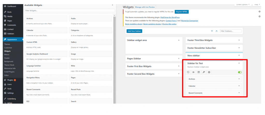 To remove the sidebar from WordPress, you’ll have to deactivate Sidebar for Test, as you can see in the image below: