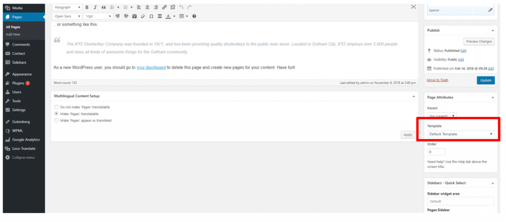 Another method you can use to remove the sidebar is to apply certain settings to your pages, from the WordPress Admin Dashboard.
