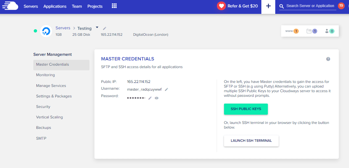 Cloudways offers a server management panel through which you can easily manage all the server-related configurations. You’ll find different sections on the panel, and each section delivers a separate set of server management functions.