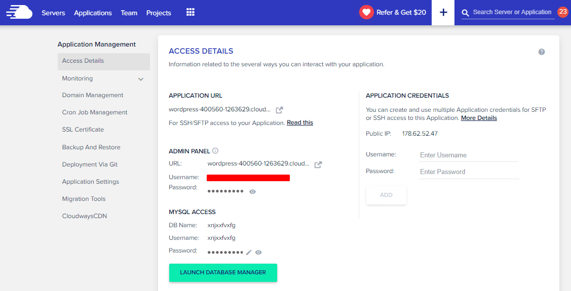 - Access Details: You’ll see your application URL, admin panel credentials, and DB access credentials.