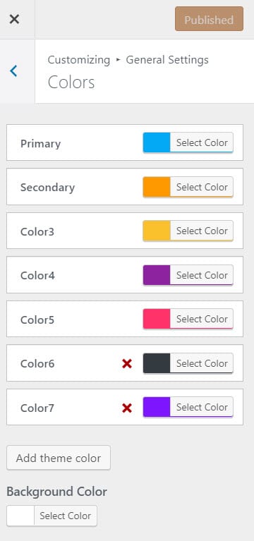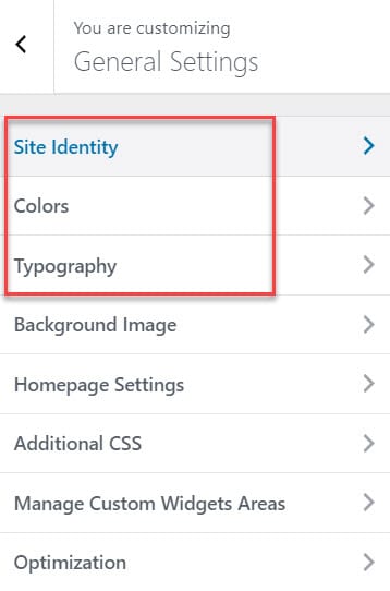 Going back to my previous example with the Mesmerize theme, inside “General settings” I have” Colors” and “Typography”.
