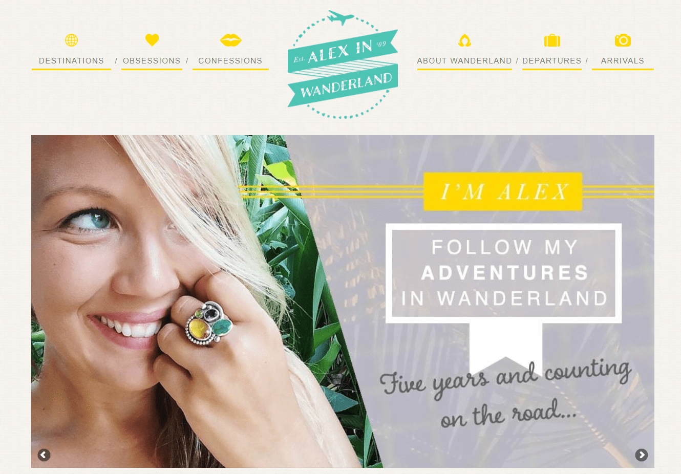 In the case of the travel blog Alex in Wanderland, in the website header, apart from a photo of Alex, users can see the beginning of a story in this header: “Five years and counting on the road…”. This is an invitation for the readers to want to explore more stories.