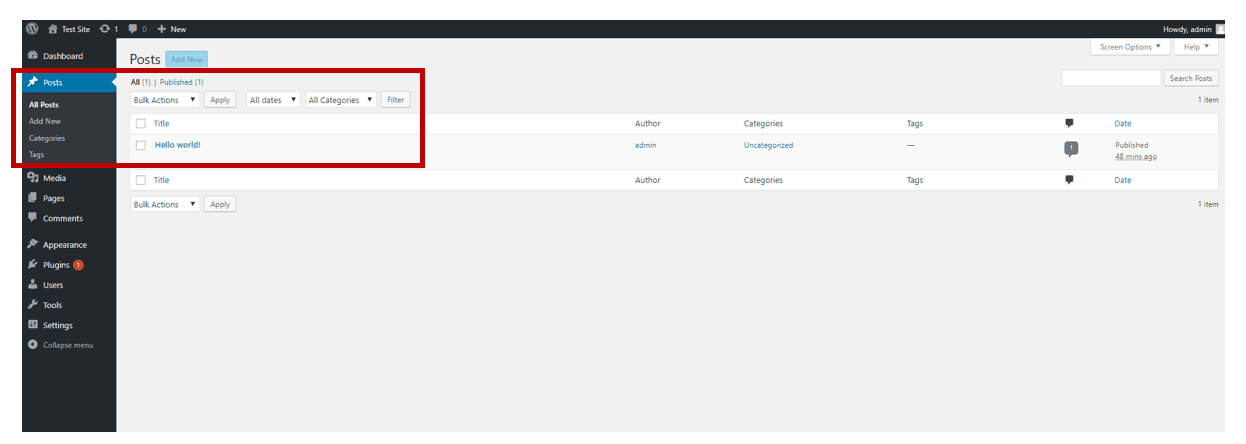 In the left-hand menu of the WordPress Admin dashboard, click on “Posts”.