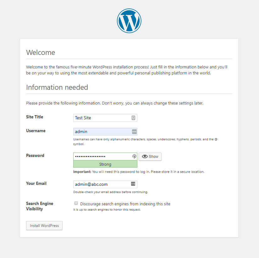Password – this is the password you’ll use to login to your WordPress Admin dashboard. Choose a password and make sure that password is a strong one.