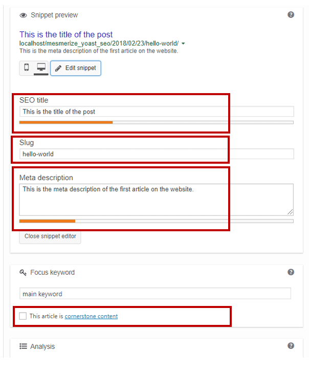 Depending on what you fill in with the Title, Description and Focus Keyword fields, Yoast SEO will make an SEO analysis. A red bullet will signal problems, orange bullets will signal results that you can improve, while green bullets will indicate optimal results.