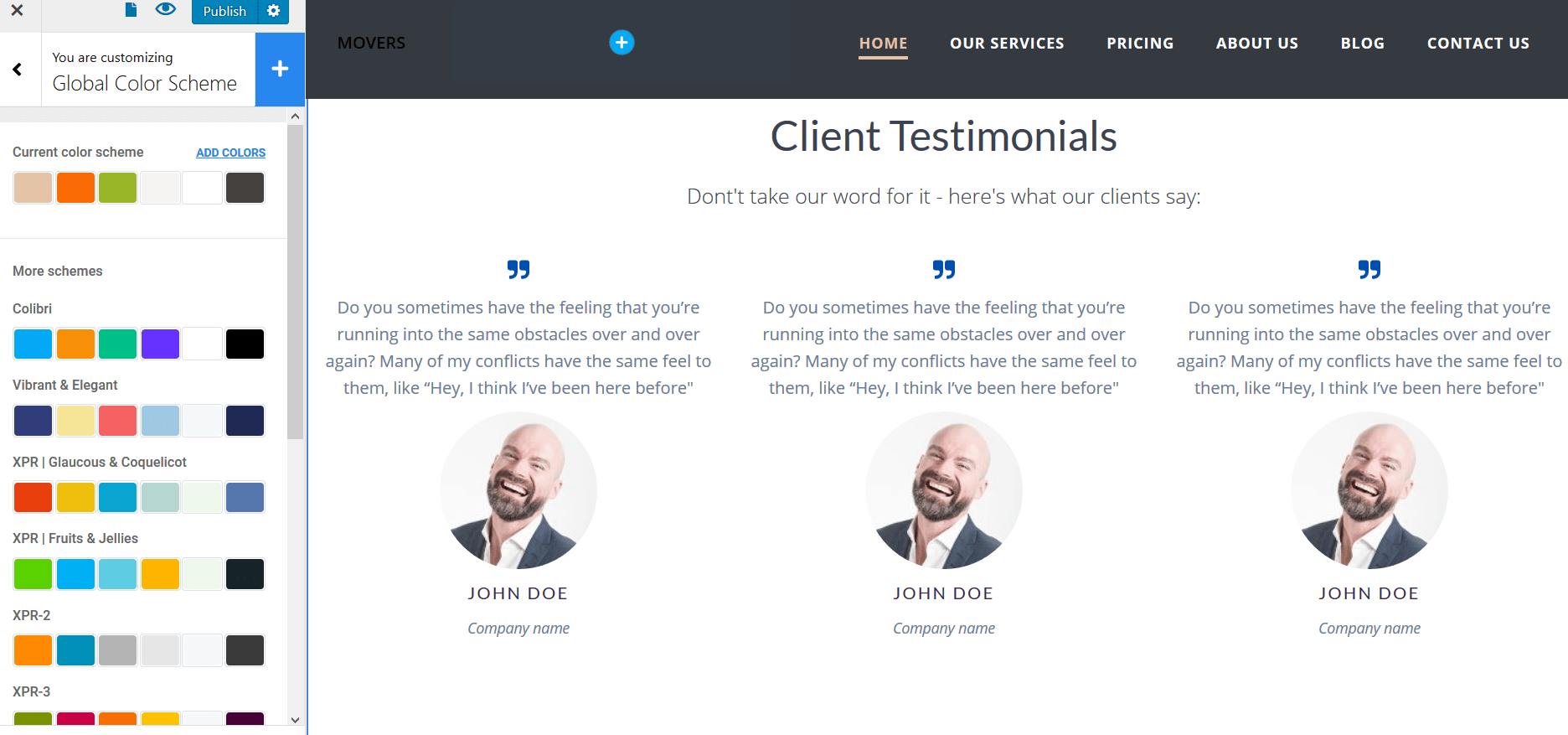 To instantly create a moving service website, you can start from the Colibriwp template. Login to the app and choose the template for Movers. You’ll go to the Customizer, and you can adjust site settings to give a unique presentation to your company.