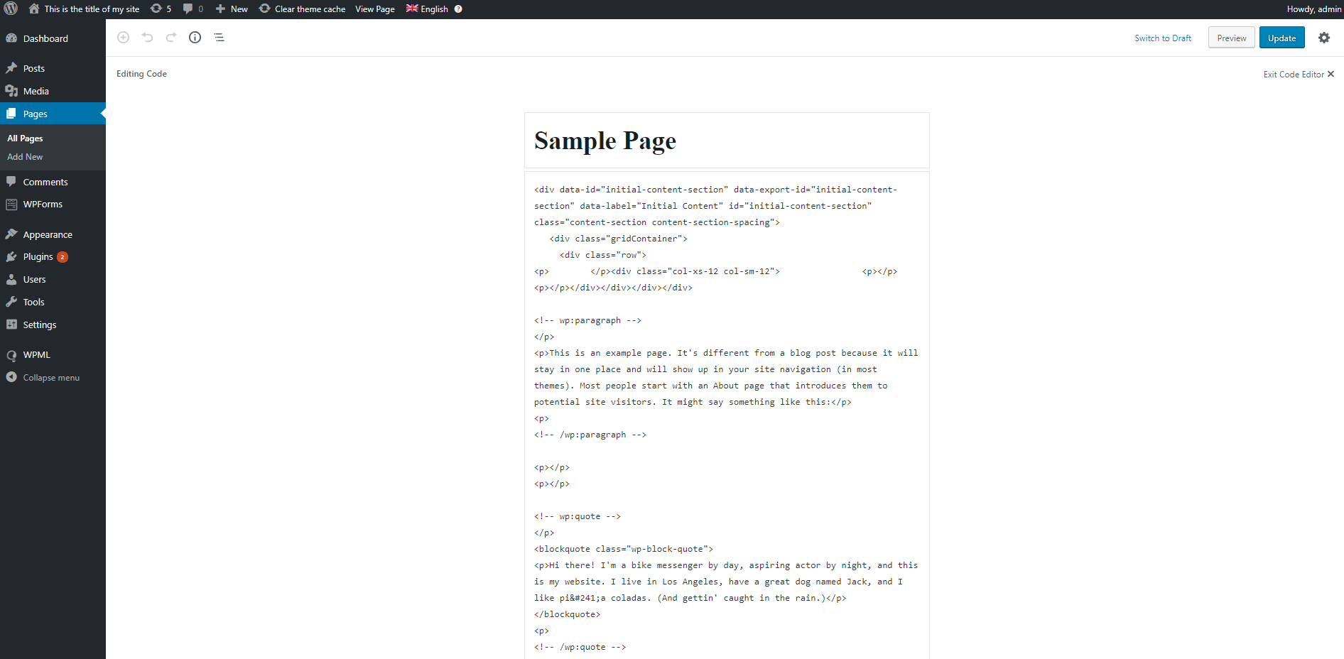 Any time you edit a post or a page, you have the option to visualize the content of that page under the form of text (code editor):