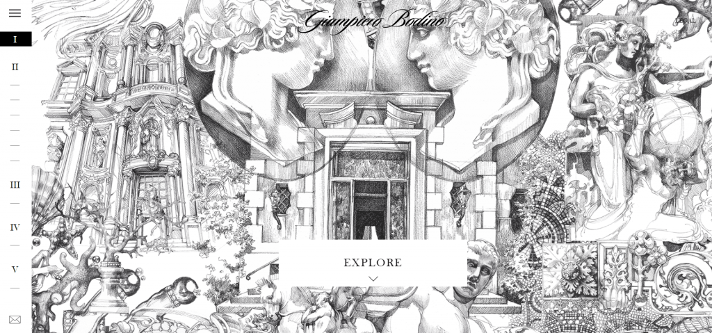 This website presents a stunning exhibition of decorations and art. It is structured in the form of a book (with chapters), or an art album. The explosion of artefacts pleases the eye and makes the reader want to further explore the website, in order to complete their experience with the Giampiero Bodino’s creations.