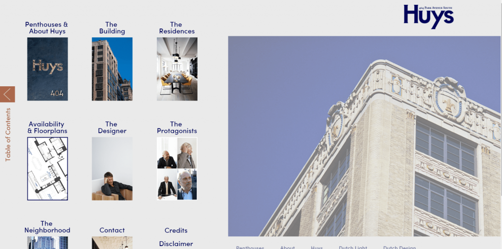 The website uses creativity in making navigation start from a sidebar table of contents. Categories in the menu appear on the left hand of the screen, whereas a suggestive image displays on the right hand of the screen.