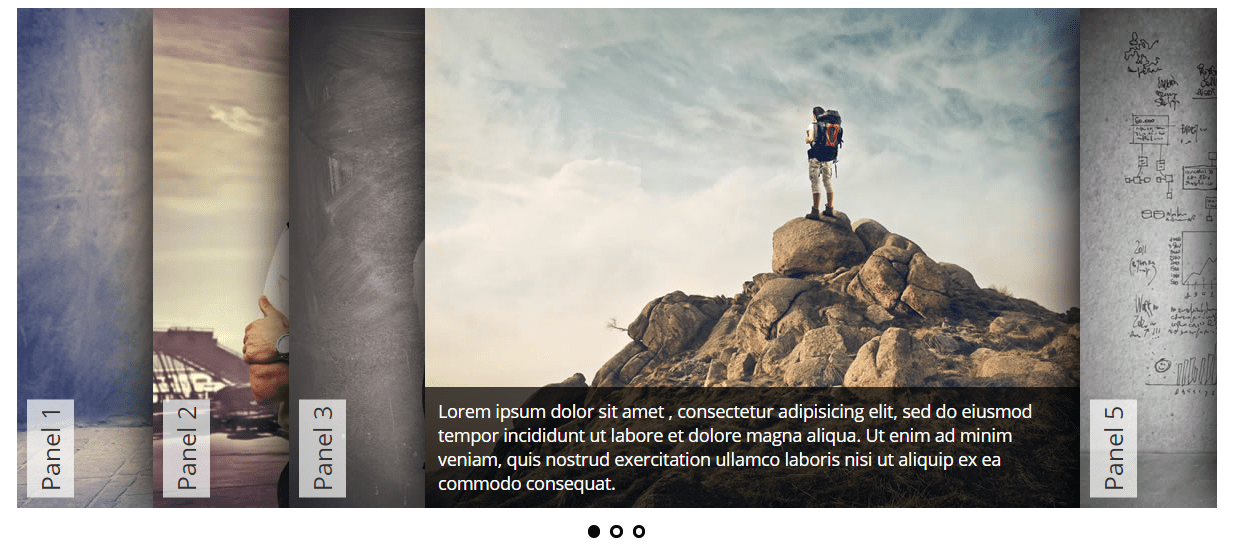 The horizontal accordion slider supposes that users go from one slide to another by clicking on the accordion tabs listed one under another. In the example above, the third tab is open by default. You open the next tabs by clicking on the tab label.