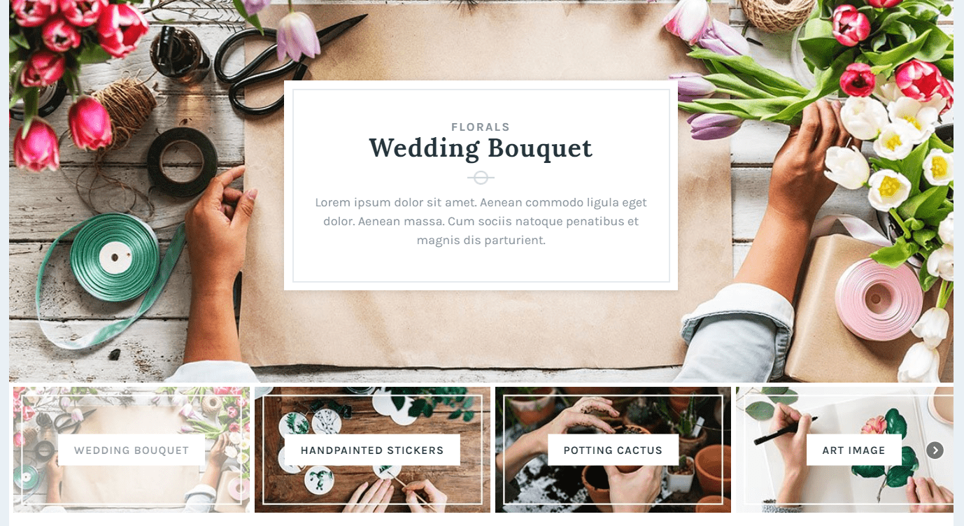 A thumbnail horizontal slider looks like in the image above. At the bottom of the slider there’s a row of thumbnails. These come one next to the other. Once you press upon one thumbnail, you open that slide content in the upper part of the component. The thumbnails can rotate if you press the side arrows.