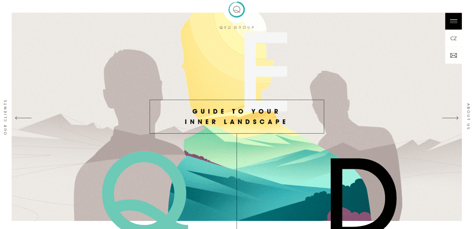 This time, grey is part of a pretty original color palette. It combines soft nuances with some yellow, blue and violet, plus black for the text. The image in the homepage Header is very suggestive, connecting with the title: “Guide to your inner landscape”. The grey suggests human silhouettes, and the “inner landscape”. Which is justified for a company specializing in applied psychology and behavioural economic fields. Text partly borrows the grey from the Header image, so text descriptions are grey.