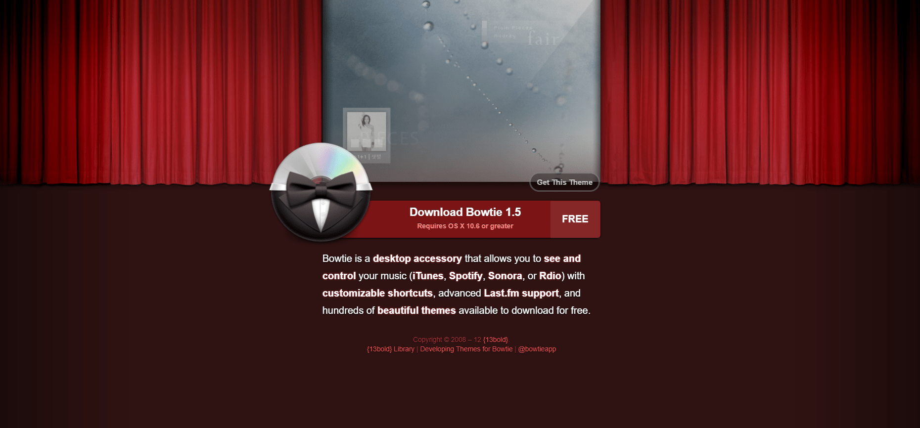 As the text in the website says it, Bowtie is a desktop accessory that allows you to see and control your music, with some nice tools they make available for you. Red presents theatre curtains that imply a show which people watch in a comfortable atmosphere. And to keep a unified style into the page, the Download button is red, too (the same nuance as the theatre curtains).