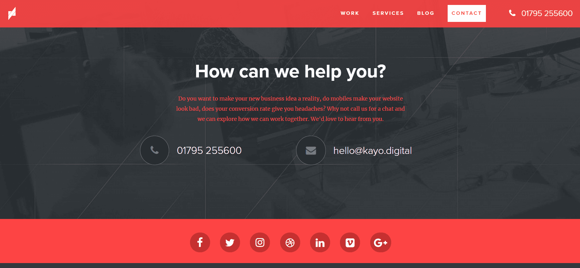 Interactive.red is a digital agency that included red into its brand identity. That’s why the term “red” is present in the very domain name of the website. Throughout the site, the red color is spread in different strategic locations, attracting attention towards the company and its services. It encourages users to take action, that is to choose Interactive.red services. One of such strategic locations is the Help section, which is delimited in the upper and lower parts by red. Also the text within this section is partially displayed in the same color, ensuring coherence in design and orienting visitors towards the best action they can take: contact Interactive.red.