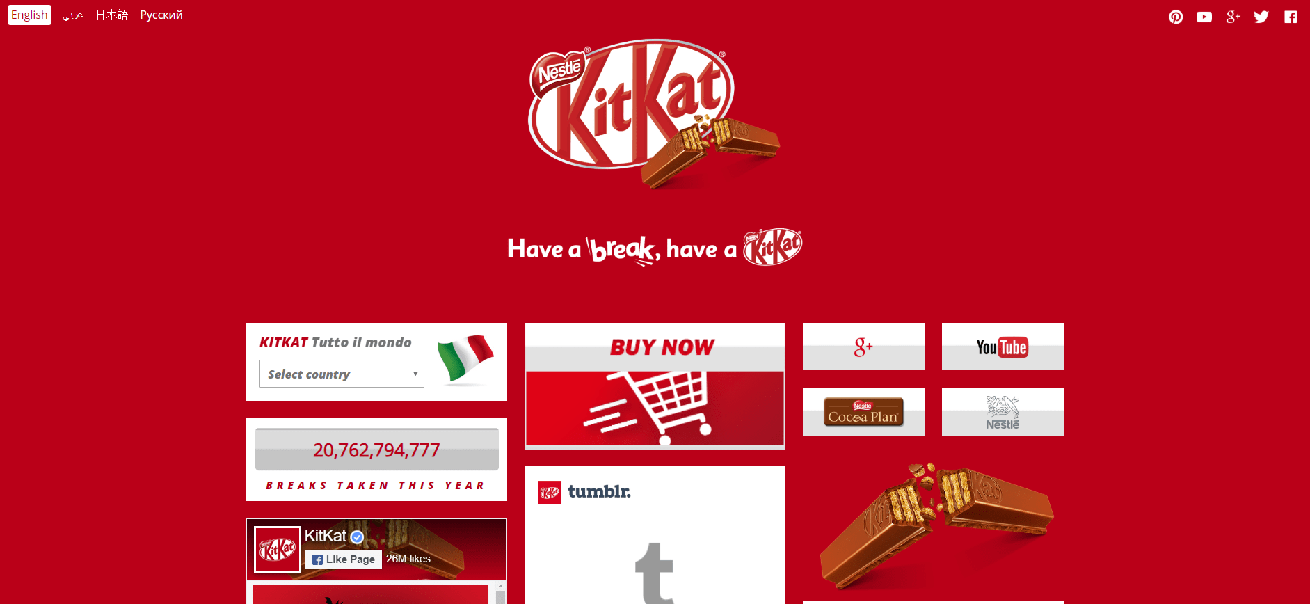 Kitkat is about dessert. It’s about indulging in savouring a KitKat, and a break. The red color palette refers to the luxury of having such moments for yourself. It encourages to buy, and it encourages to taste the KitKat. In this case, the website background is all red, which means you shouldn’t wait long before buying. The white of text boxes creates good contrast, and keeps the attention focused onto the site presentation. Otherwise, the presentation is simple, easy to scan and appealing to readers’ emotional level.