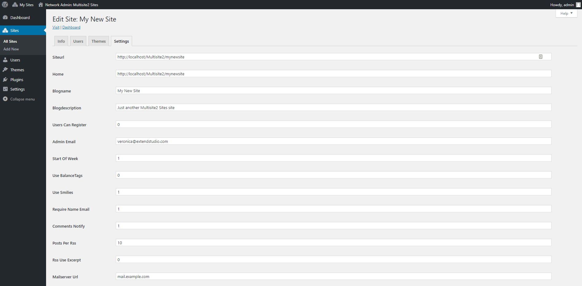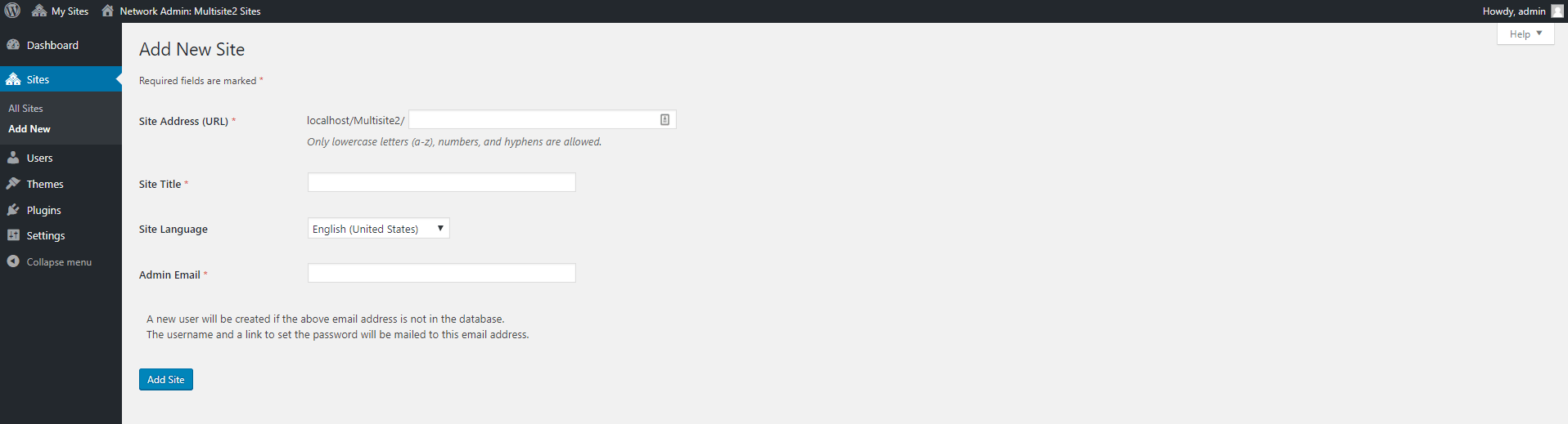 - The email address of the admin for this new site (fill in this area with the email address of the person you want to give admin status for the new website).