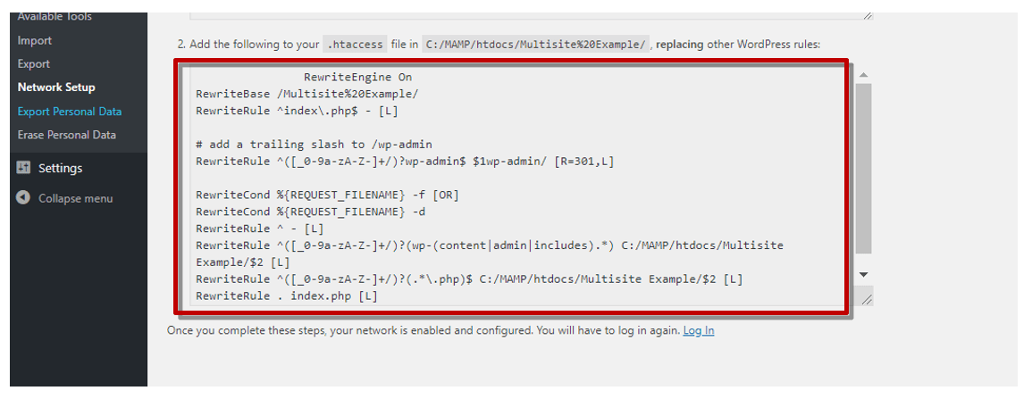 Replace the lines of code with the ones you copy from the WordPress dashboard for Enabling the Network: