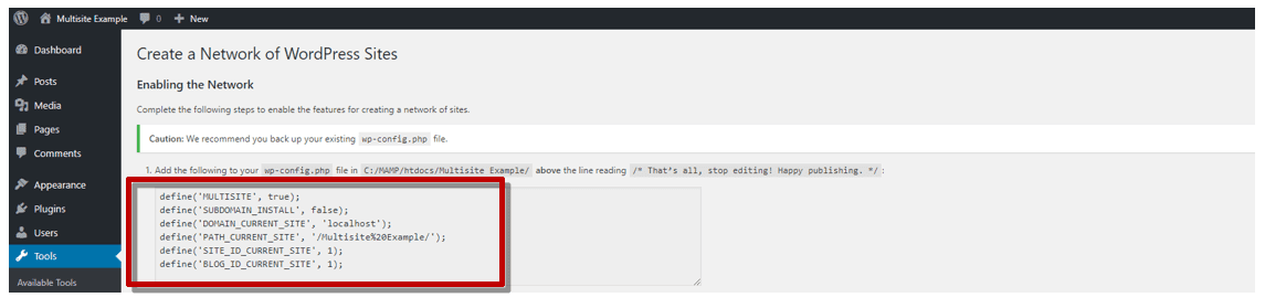 The first change to the wp-config.php file concerns adding lines of code that allow for enabling the Network Setup menu item.
