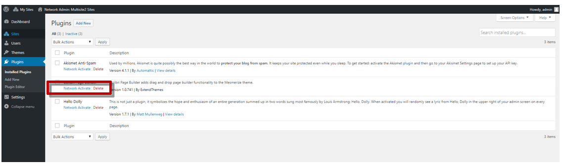 The same goes for plugins. To install and activate plugins for the sites in the network, the Super Admin makes the necessary changes from My Sites -> Network Admin -> Plugins.