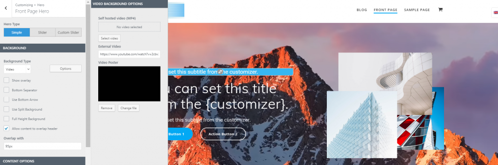 - Open the Customizer. Go to Hero -> Front Page Hero/Inner Pages Hero.