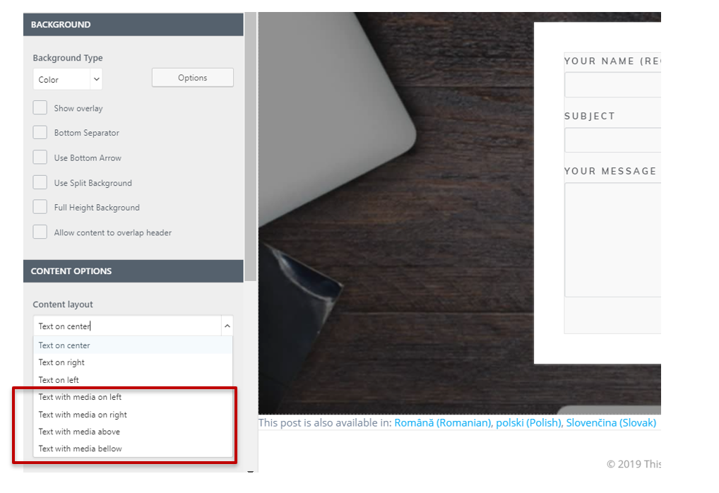 - Go to the subsection Content -> Content layout. Then, select Text with Media to display in the page Hero.
