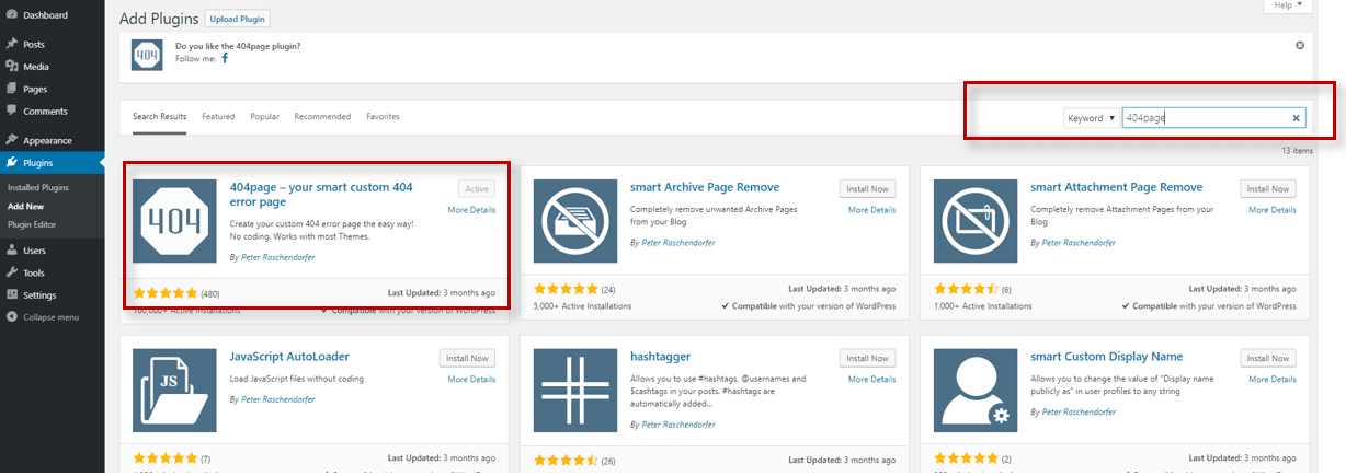 3. In the search bar placed on the right side of the dashboard, type in 404Page (the name of the plugin).