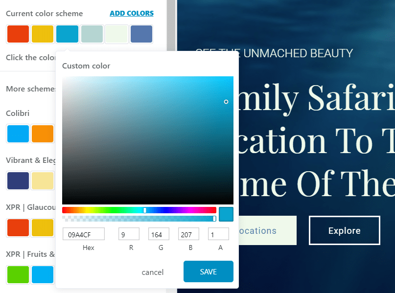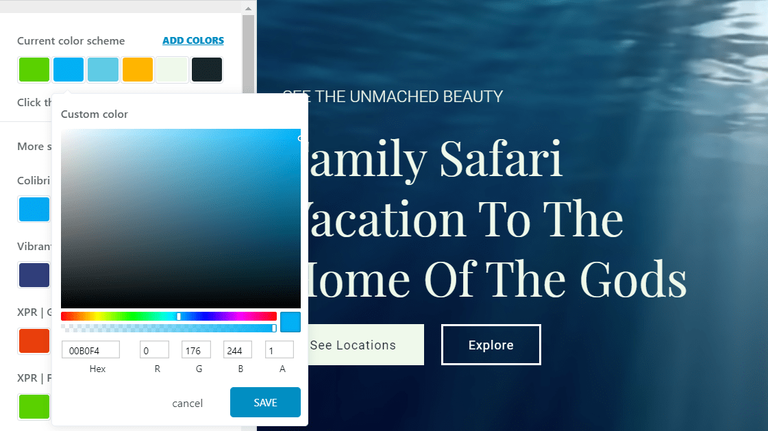 For ease of use, each color in the selected color scheme has details about the HEX code. This way, the color can be replicated anywhere else into the site, by just introducing the same HEX code for the element you want to customize.