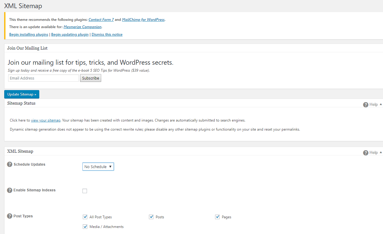 With All in One SEO Pack, you have lots of control over the XML Sitemap configuration. You can choose what content types will be added to the sitemap, create a compressed sitemap, and enable the option to dynamically generate a sitemap or schedule updates for the sitemap (in accordance with the frequency of publishing new content).