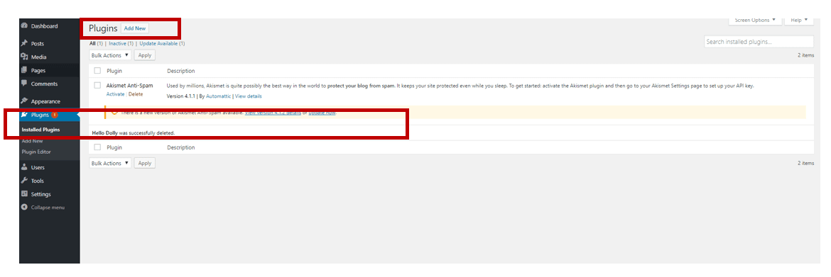 If you go to Installed Plugins, you’ll find a table with all plugins that you’ve already installed and activated for the website. You can manage them from that table (Activate, Deactivate or Delete plugin).