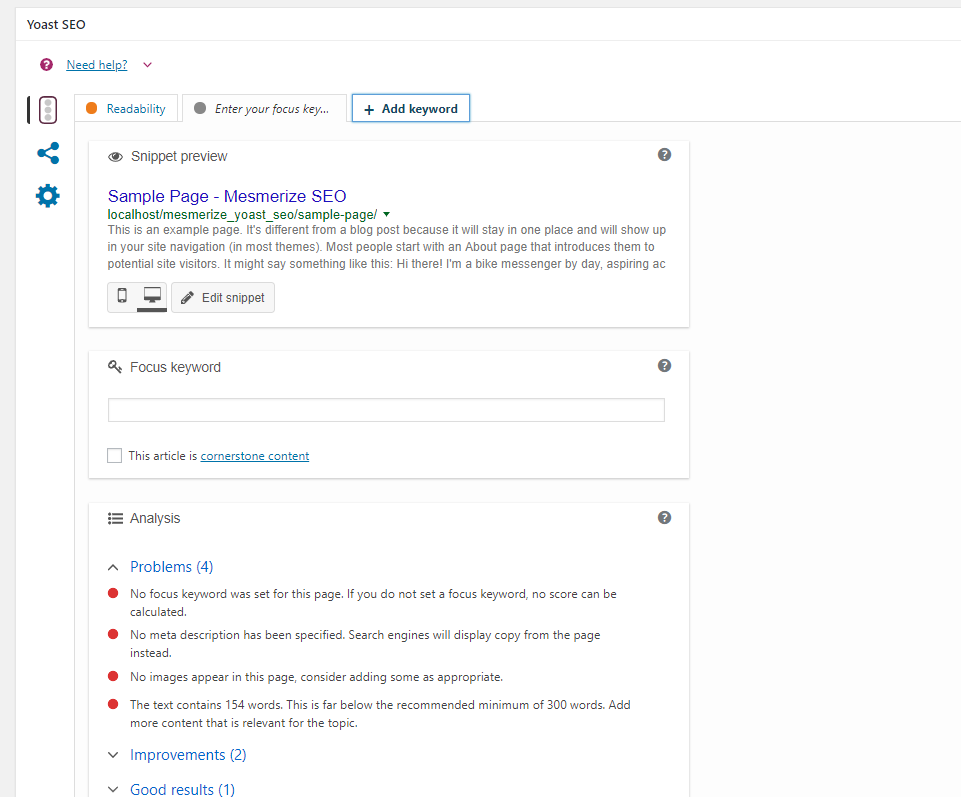 Depending on what you fill in with the Title, Description and Focus Keyword fields, Yoast SEO will make an SEO analysis. A red bullet will signal problems, orange bullets will signal results that you can improve, while green bullets will indicate optimal results.