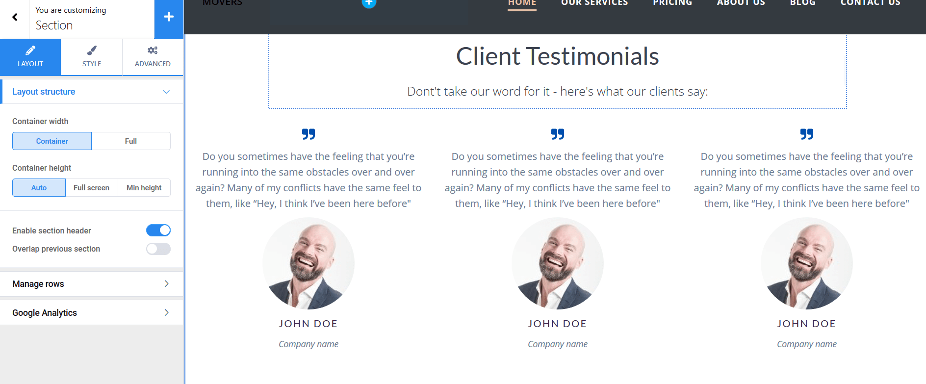 It’s important for a website in this niche to gain trust, in order to maximize conversions. That’s why we included a Testimonials section into the page. You can adjust its settings by clicking on the cog icon next to the respective section, and use the Layout, Style and Advanced tabs to make full use of the settings for that section in the page: