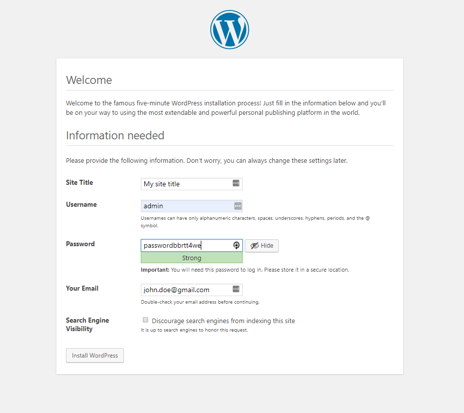 - a password (the username and password will be the details you need for logging into your WordPress Admin)