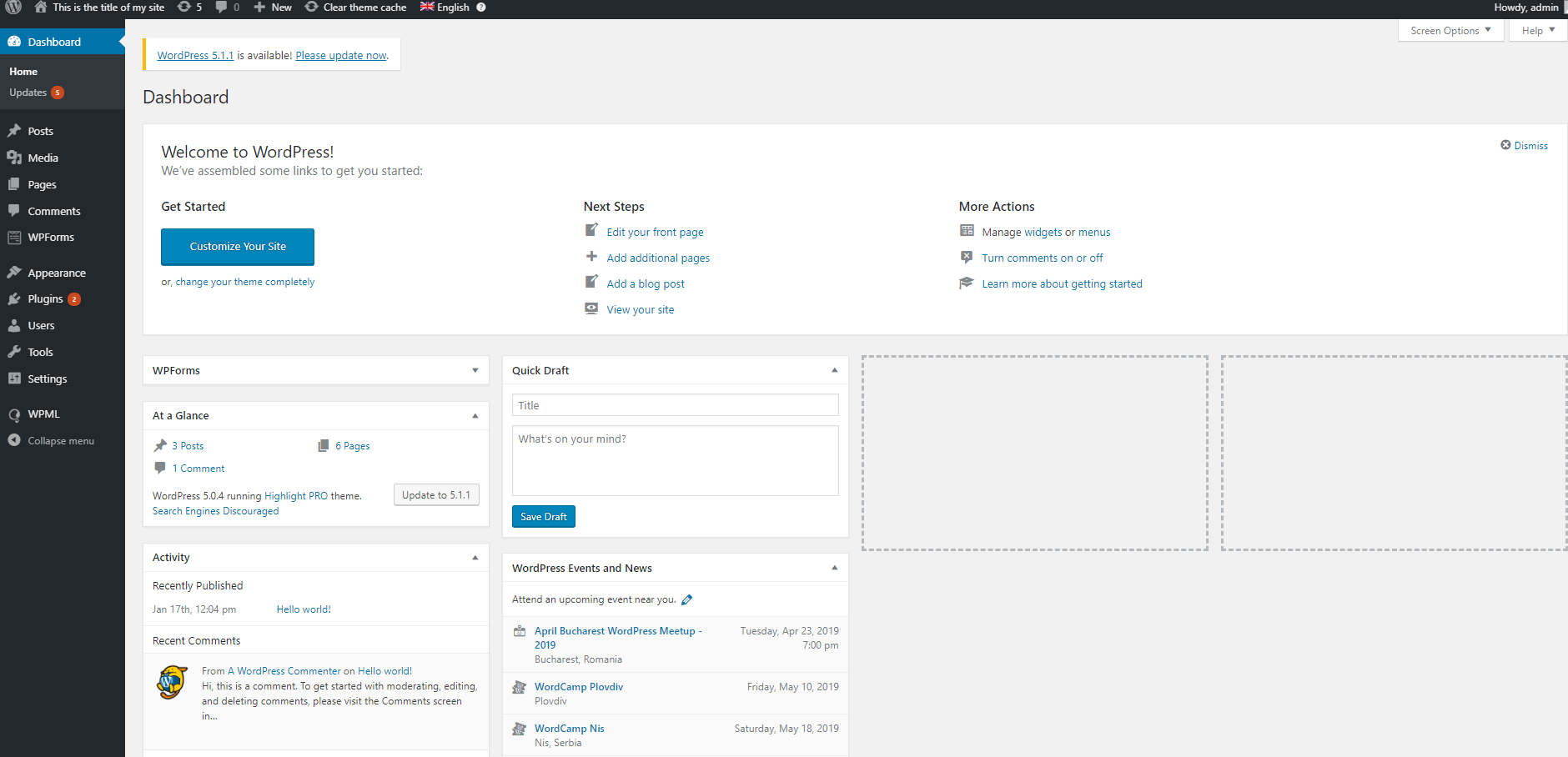 Go to wordpress.org and find the download link for WordPress. You’ll download the latest version of WordPress. Afterwards, you’ll have to check for updates, and make sure you install them for your site.