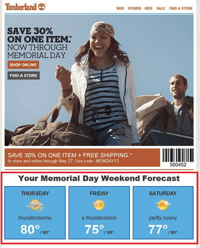 - Live content. If you want your prospects to buy right from their inbox and you’ve set an online payment, and you’re ready to go, then live content is all you need. And live content doesn’t mean email images that change. It means countdown timers or weather-based emails. Content like that one takes advantage of the impulsive nature of purchasing, especially when coupled with something as targeted as the weather conditions of the prospect’s area.b