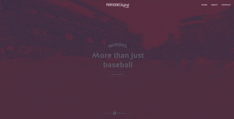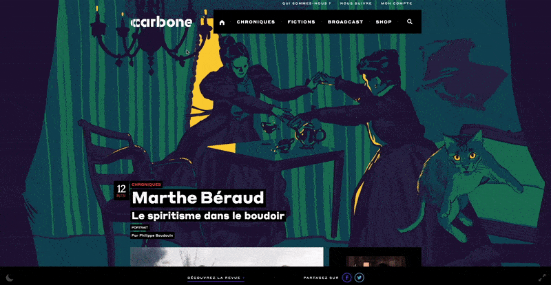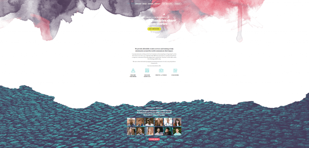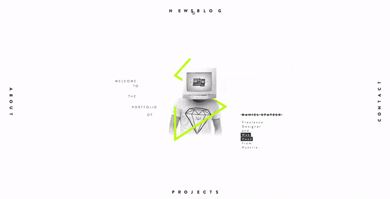 The attention is retained by a succession of graphics in the middle of the homepage, delimitated from the rest by geometrical yellow lines. Motion is added to this succession of graphics, which deconstructs the images in a funny and interesting way. The website also makes good use of typography styles, that go from the norm towards unconventional writing.