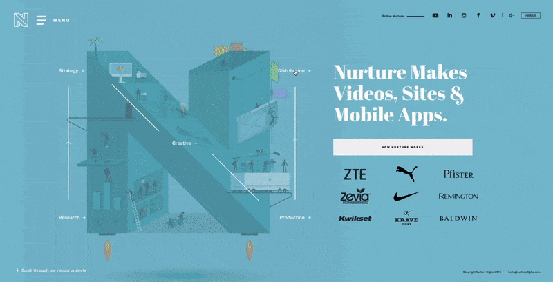 The website takes you on a road to exploring. The transitions from one page to another, from one section to another, are nothing but a surprise. If you let yourself led by the intuitive navigation, you will be mesmerized by how much Nurturedigital has to show.