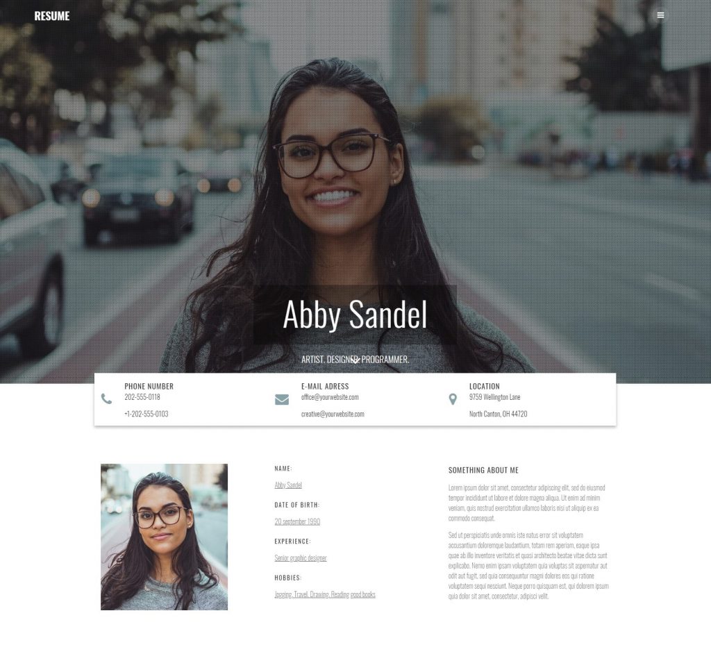 This is a demo from our Mesmerize theme. Our designers set out to make a resume website for a prospective employee that was at once professional, to the point, and friendly. In the browser, the header image takes up the whole above-the-fold space and allows the candidate to warm up the visitor with an image of him before visitors scroll down to their actual skills and professional experience.