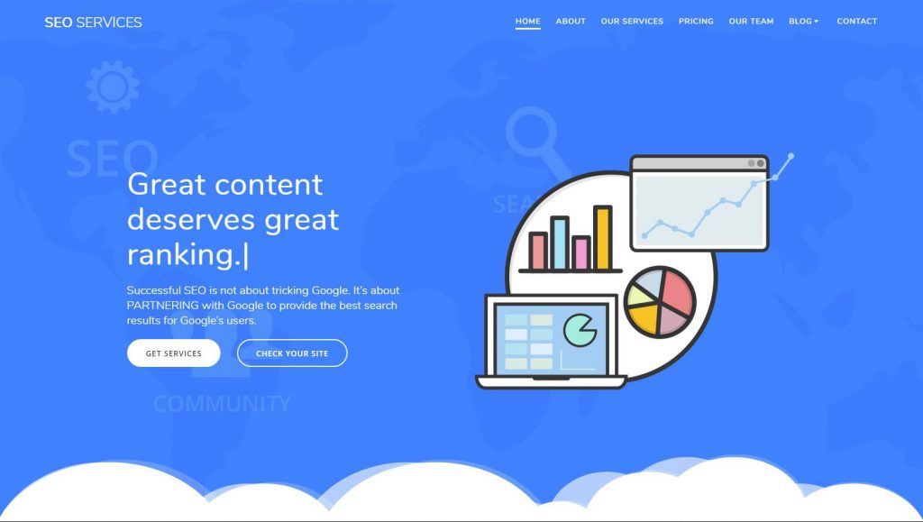 This is a demo from the Mesmerize theme, and where the header image is a dynamic element that constantly changes the copy of the text from “ranking” to “optimization” and so on. Since it’s an agency website, our designers for a calming blue, for its effects on increasing user trust, stylized cartoons of serious stuff such as charts and analytics, remind the user that this is a professional company at ease with complex problems.