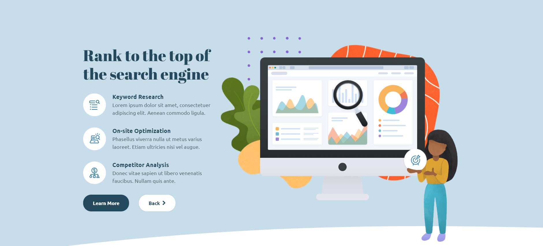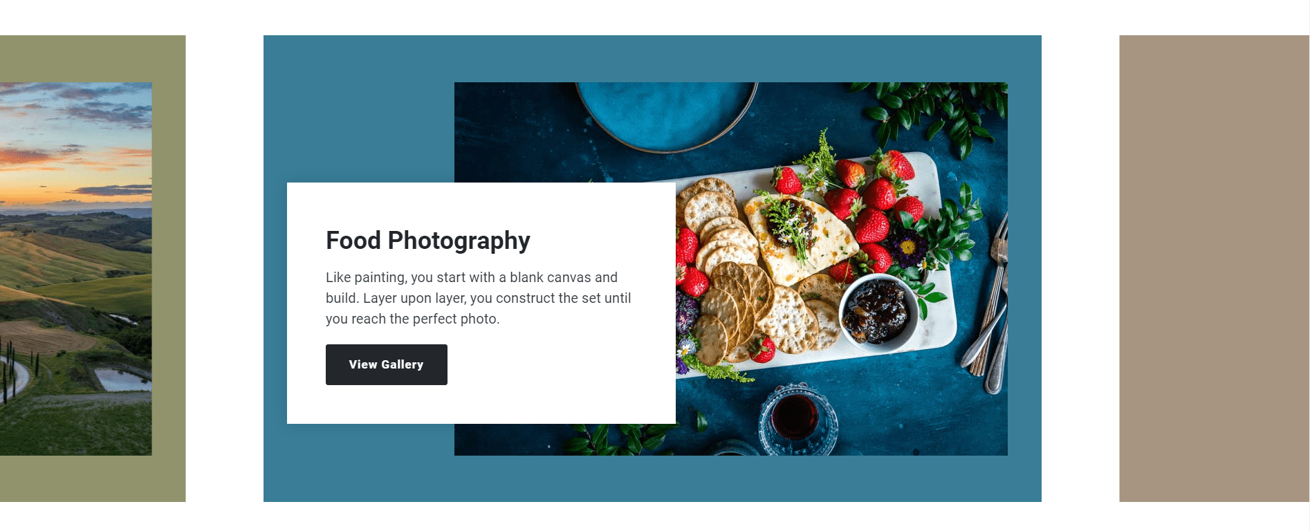 This type of slider brings to front one slide at a time. The adjacent slides are kept in the background, and they’re marked with an overlay color that makes them less obvious than the main slide. Also, there’s the Dots component that signals what slide is currently being viewed.