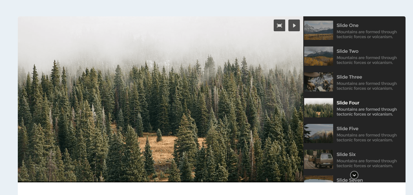 A thumbnail horizontal slider looks like in the image above. At the bottom of the slider there’s a row of thumbnails. These come one next to the other. Once you press upon one thumbnail, you open that slide content in the upper part of the component. The thumbnails can rotate if you press the side arrows.