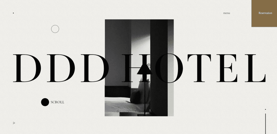 This website is representative for a hotel presentation. The homepage and the Hero of the homepage are designed so as to incorporate much white space. You already know white space is very important in web design, and DDD Hotel uses it wonderfully. As to color combinations, beyond white, the website has a touch of brown and some more grey and black. The text is colored in black, to contrast well with the other colors in the background image. Each section in the homepage has an indicator to what the user should do next: it’s a circle (of different colors throughout the page) that signals the next step in the website navigation. In the first 2 sections, the circle is black/white, to be easily distinguishable from the rest of the respective sections.