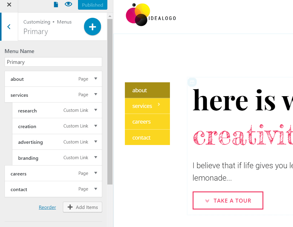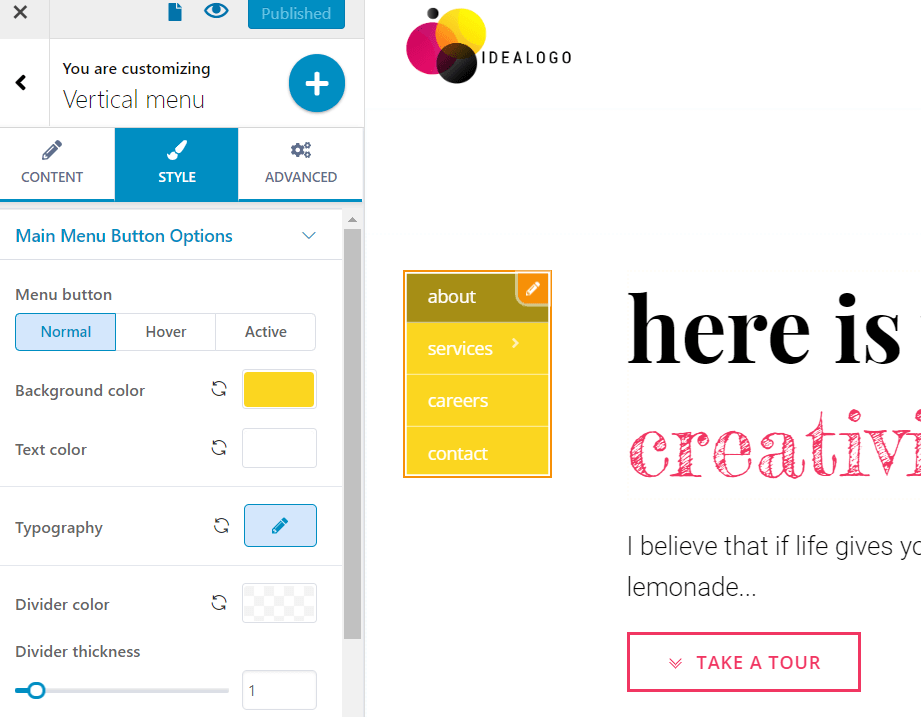 Click on the menu in the Customizer and you’ll open the panel with customization options for this component. They’ll give you the possibility to adjust background color, text color, typography, divider aspect (if the menu has secondary levels), etc.