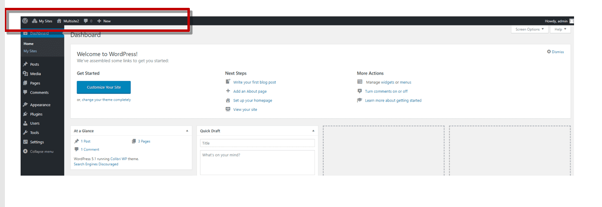 Make sure you are logged in to your WordPress. In the left upper part of the screen, a new icon (“My sites”) is now displayed, next to the name of the initial website you created.