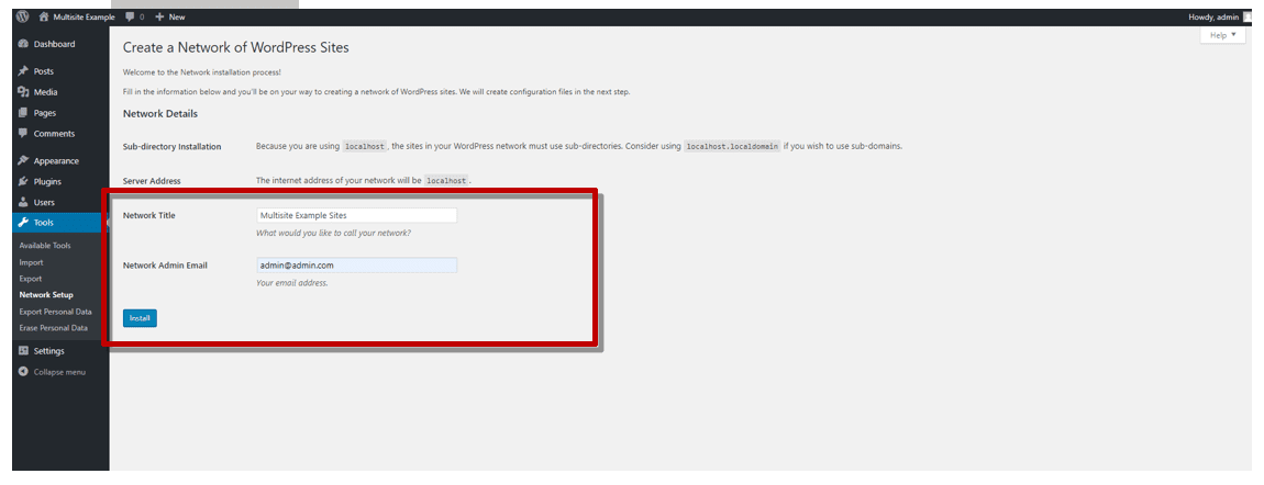 Go to Tools -> Network Setup to open the dashboard for creating the network of multiple sites. Before you can make any changes here, you need to deactivate all plugins.