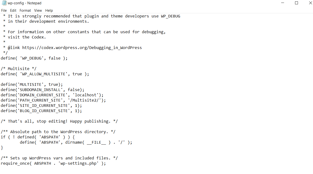 The first change to the wp-config.php file concerns adding lines of code that allow for enabling the Network Setup menu item.