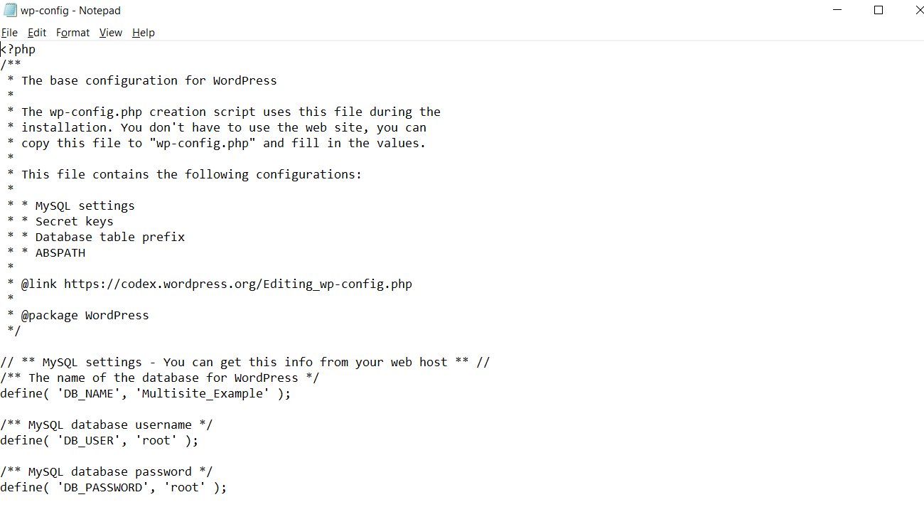 Open the wp-config.php file (find the file, right-click & open with notepad – or another text editor you have installed). It will open with a text editor and looks as you see in the screenshot below: