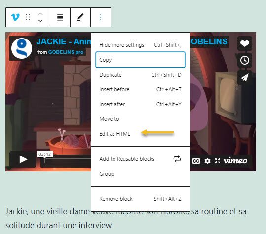 Now that you have inserted your video, you can make some edits to it if you have some minimum HTML know-how. All you need to do is select the video, and click on the three vertically-aligned dots in the menu above the video. Select the “Edit as HTML” option.
