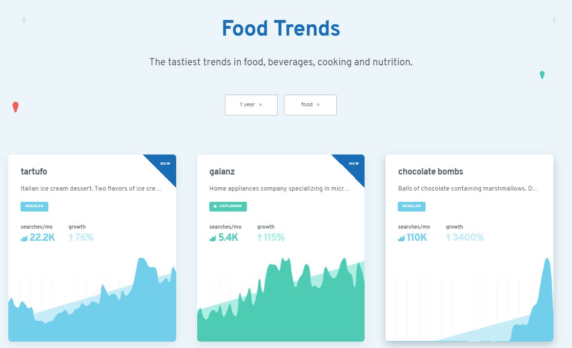 Self-preservation (physical health, safety, and secure environment) is one of three basic instincts every person has, so there’s no surprise why food and lifestyle blogs are so popular. Everyone needs (and loves!) to eat, this is why blogs with recipes or interesting facts about food attract a large audience. The data taken from Exploding Topics on food trends say it all.